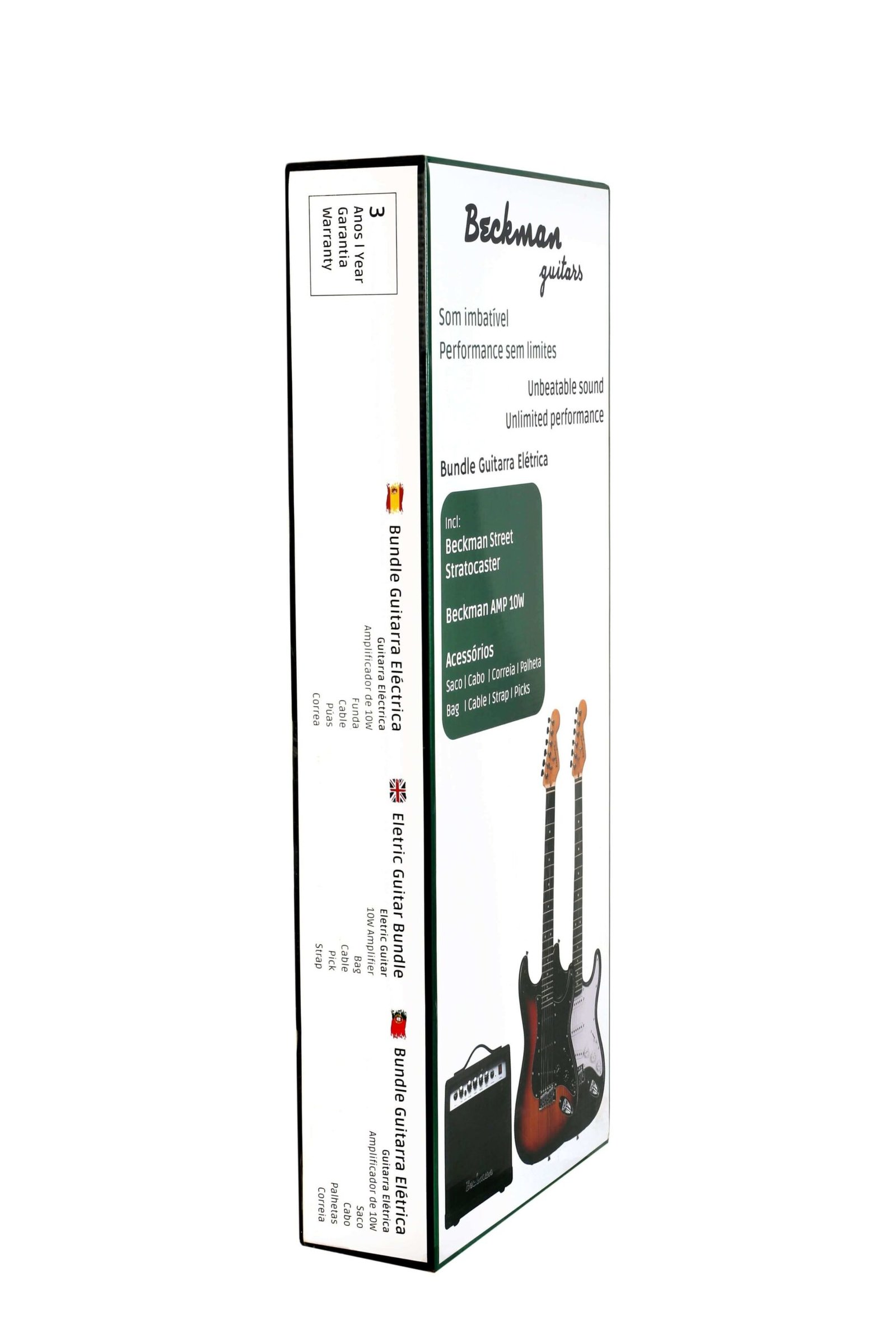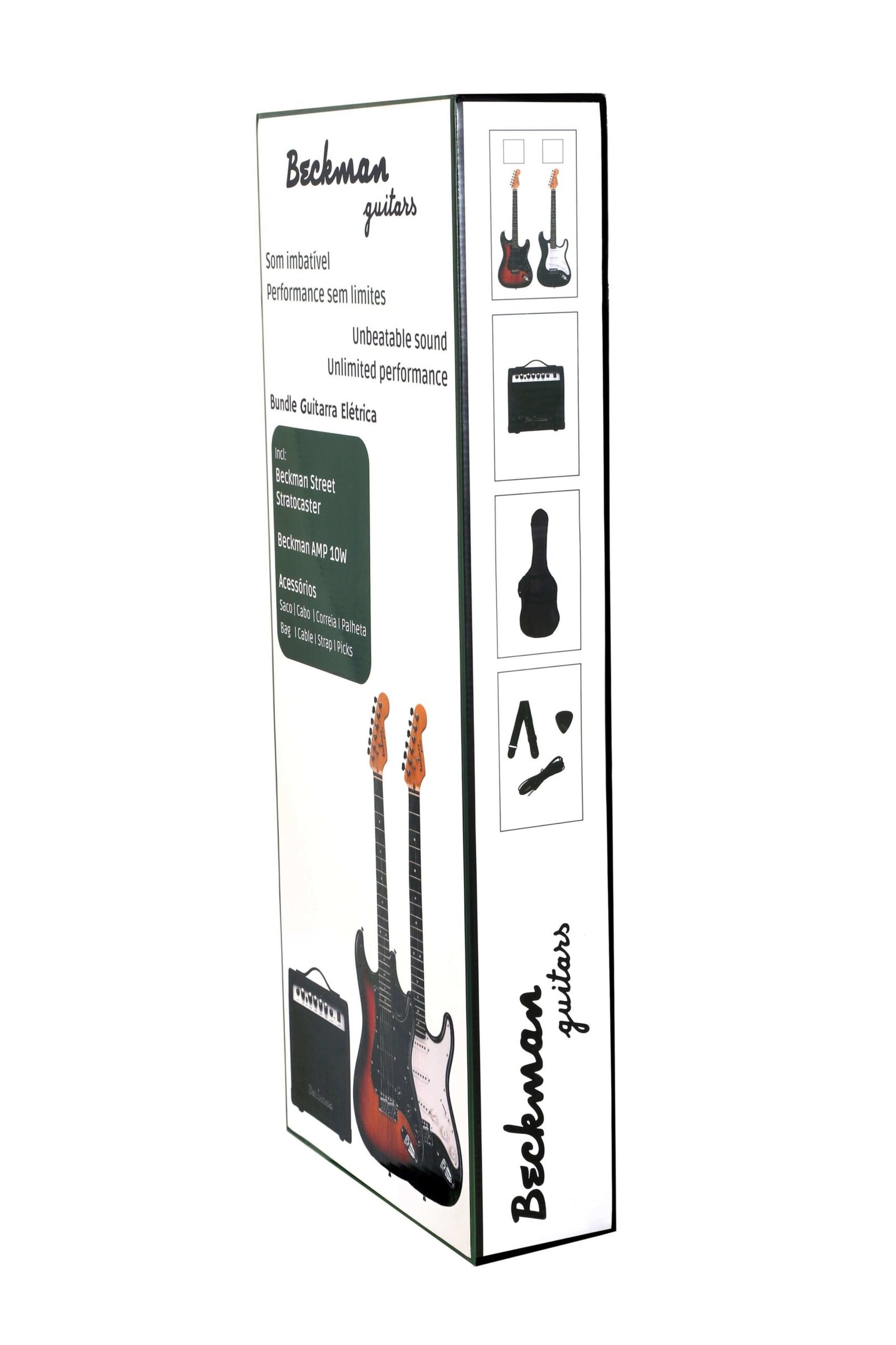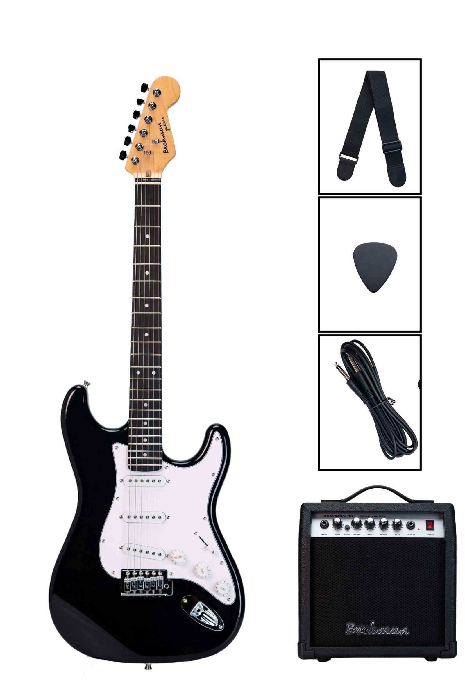 Bundle Guitarra Elétrica Beckman Stratocaster Preta/Black –  Ideal para quem se está a iniciar no instrumento. Este conjunto oferece uma solução completa, com tudo o que é preciso para começar a tocar, tornando a entrada no mundo da música elétrica mais fácil e acessível.